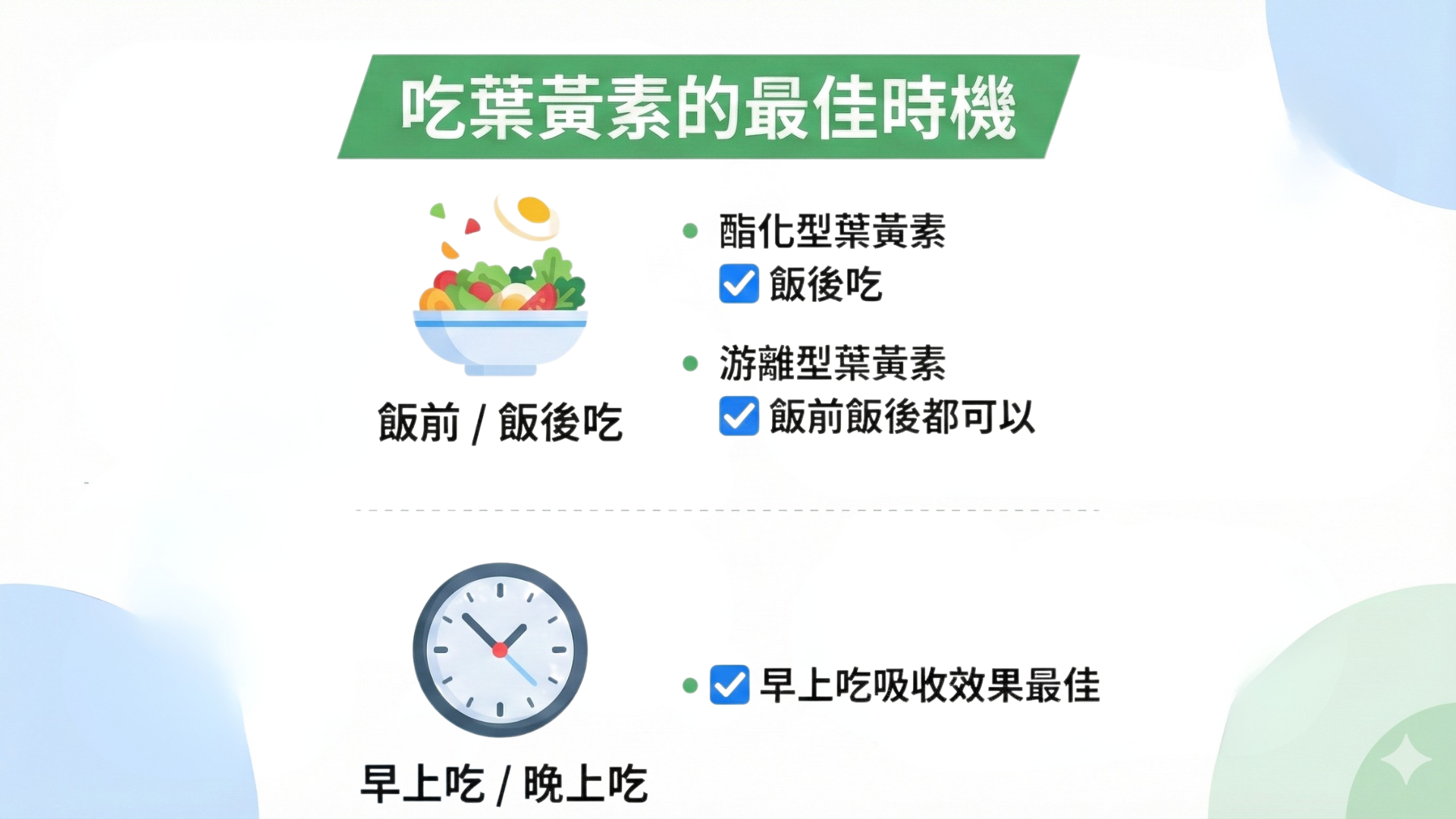 葉黃素推薦早上餐後吃,因為人體早晨的代謝率與吸收能力比較好,此時攝取營養素,更能充分利用。