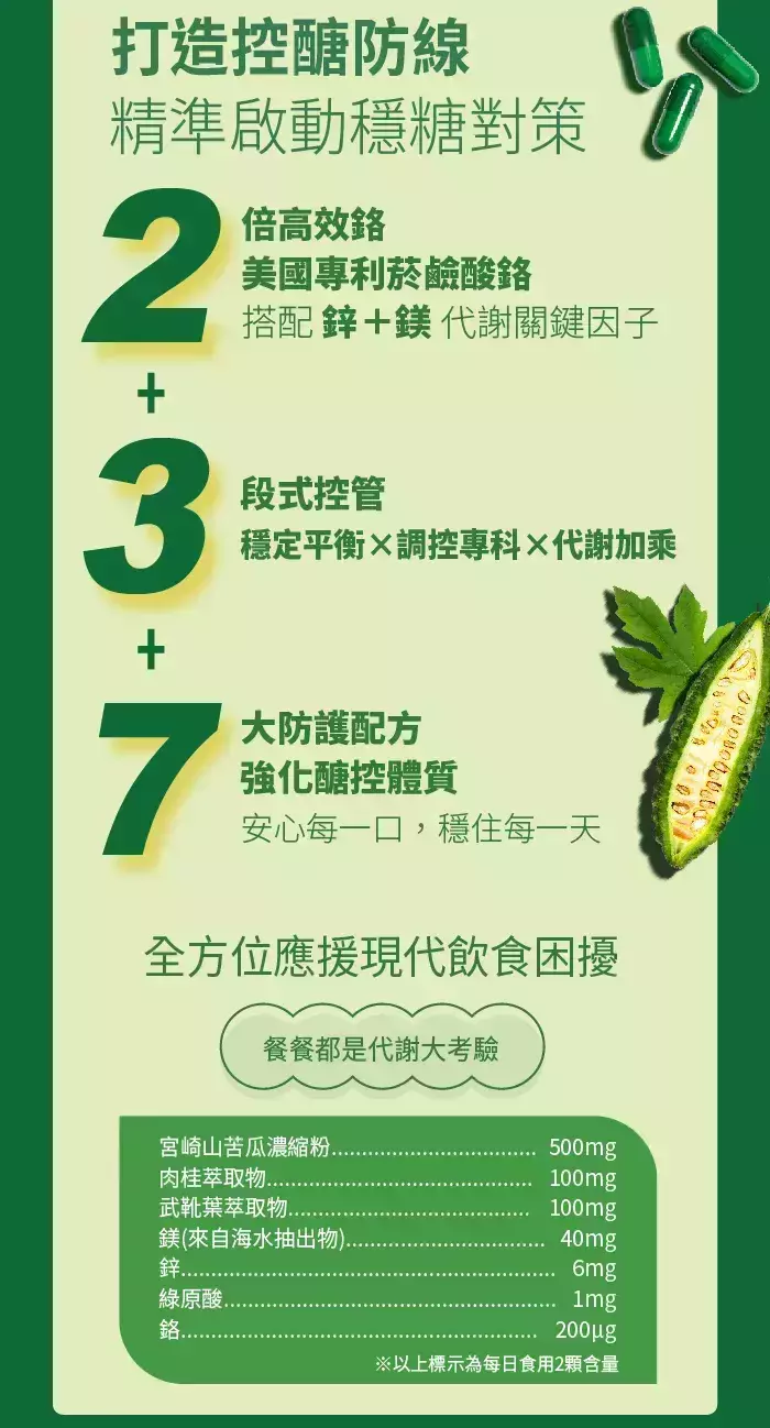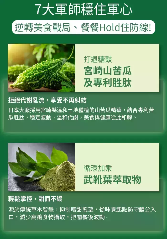 ◎由日本宮崎山苦瓜+專利苦瓜胜肽領軍,用3段式控管、7大防護配方護航,陪你戰勝每一場美食挑戰◎